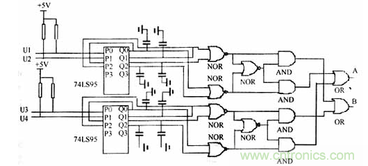 位移除了有大小的屬性外,還具有方向的屬性。為了辨別標尺光柵位移的方向,僅靠一個光敏元件輸出一個信號是不行的。必須有2個以上的信號根據(jù)他們的相位不同來判斷位移方向。因此,本設計采用的是4個硅光電池來接收莫爾條紋信號,則輸出的4路信號在相位上依次相差90°,利用這種特點設計的辨向電路的如圖3所示。圖中u1,u2和u3,u4分別通過相同的電路實現(xiàn)對位移方向的區(qū)別。當莫爾條紋上移時(假設經(jīng)過硅光電池的前2個,此時u1,u2有信號,u3,u4無信號),則圖中A點有計數(shù)脈沖,B點為恒定電平;當莫爾條紋下移時(假設經(jīng)過硅光電池的前2個,此時u1,u2有信號,u3,u4無信號),則圖中B點有計數(shù)脈沖,A點為恒定電平。用2個不同計數(shù)器分別記錄上移和下移所形成的脈沖數(shù),即可實現(xiàn)辨向。