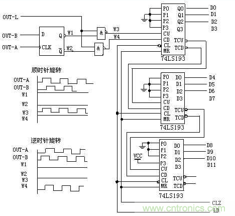 當(dāng)光電編碼器順時針旋轉(zhuǎn)時,通道A輸出波形超前通道B輸出波形90°,D觸發(fā)器輸出Q(波形W1)為高電平,Q(波形W2)為低電平,上面與非門打開,計數(shù)脈沖通過(波形W3),送至雙向計數(shù)器74LS193的加脈沖輸入端CU,進(jìn)行加法計數(shù);此時,下面與非門關(guān)閉,其輸出為高電平(波形W4)。當(dāng)光電編碼器逆時針旋轉(zhuǎn)時,通道A輸出波形比通道B輸出波形延遲90°,D觸發(fā)器輸出Q(波形W1)為低電平,Q(波形W2)為高電平,上面與非門關(guān)閉,其輸出為高電平(波形W3);此時,下面與非門打開,計數(shù)脈沖通過(波形W4),送至雙向計數(shù)器74LS193的減脈沖輸入端CD,進(jìn)行減法計數(shù)。