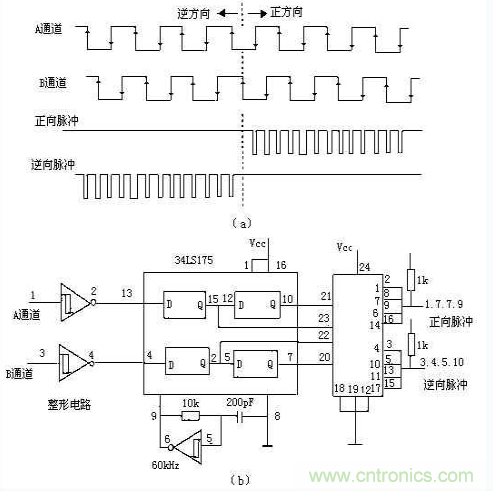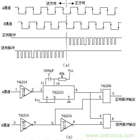 增量編碼器是以脈沖形式輸出的傳感器,碼盤比絕對編碼器碼盤要簡單得多且分辨率更高。一般只需要三條碼道,這里的碼道實際上已不具有絕對編碼器碼道的意義,而是產(chǎn)生計數(shù)脈沖。它的碼盤的外道和中間道有數(shù)目相同均勻分布的透光和不透光的扇形區(qū)(光柵),但是兩道扇區(qū)相互錯開半個區(qū)。當(dāng)碼盤轉(zhuǎn)動時,它的輸出信號是相位差為90°的A相和B相脈沖信號以及只有一條透光狹縫的第三碼道所產(chǎn)生的脈沖信號(它作為碼盤的基準(zhǔn)位置,給計數(shù)系統(tǒng)提供一個初始的零位信號)。從A,B兩個輸出信號的相位關(guān)系(超前或滯后)可判斷旋轉(zhuǎn)的方向。由圖3(a)可見,當(dāng)碼盤正轉(zhuǎn)時,A道脈沖波形比B道超前π/2,而反轉(zhuǎn)時,A道脈沖比B道滯后π/2。圖3(b)是一實際電路,用A道整形波的下沿觸發(fā)單穩(wěn)態(tài)產(chǎn)生的正脈沖與B道整形波相‘與’,當(dāng)碼盤正轉(zhuǎn)時只有正向口脈沖輸出,反之,只有逆向口脈沖輸出。增量編碼器是根據(jù)輸出脈沖源和脈沖計數(shù)來確定碼盤的轉(zhuǎn)動方向和相對角位移量。通常,若編碼器有N個(碼道)輸出信號,其相位差為π/ N,可計數(shù)脈沖為2N倍光柵數(shù),現(xiàn)在N=2。圖3電路的缺點是有時會產(chǎn)生誤記脈沖造成誤差,這種情況出現(xiàn)在當(dāng)某一道信號處于‘高’或‘低’電平狀態(tài),另一道信號正處于‘高’和 ‘低’之間的往返變化狀態(tài),此時碼盤雖然未產(chǎn)生位移,但是會產(chǎn)生單方向的輸出脈沖。例如,碼盤發(fā)生抖動或手動對準(zhǔn)位置時(下面可以看到,在重力儀測量時就會有這種情況)。