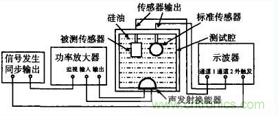 采用間接比較法測量傳感器的靈敏度,在聲場均勻的油腔內(nèi),距發(fā)射源相同距離處放置標(biāo)準(zhǔn)傳感器和被測傳感器,兩傳感器同時(shí)接收換能器發(fā)射的聲波信號(hào),用示波器分別測量2只傳感器的輸出峰值電壓V標(biāo)和V測,得到V標(biāo)/V測=M標(biāo)/M測,即