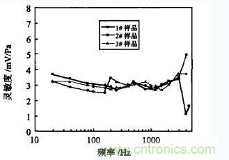 樣品采用北京信息工程學(xué)院研制的YLC-A型壓電式微壓傳感器,樣品數(shù)為3只。將傳感器安裝在測試腔蓋樣品架上,輸出端與腔蓋上的樣品輸出引線連接,扣緊腔蓋,按圖1所示連接系統(tǒng)。由于傳感器內(nèi)裝前置放大器,需提供直流電源工作,電源加在腔蓋上被測傳感器輸出端。調(diào)節(jié)信號(hào)發(fā)生器產(chǎn)生正弦信號(hào),信號(hào)幅度不宜過大,以避免傳感器輸出失真。取多個(gè)信號(hào)頻率,分別測量每個(gè)頻率點(diǎn)兩傳感器的輸出電壓,在1kHz處示波器上的標(biāo)準(zhǔn)傳感器波形(1)的峰-峰值電壓為145.5mV;被測傳感器波形(2)的峰峰值電壓為5.85V。將V標(biāo)和V測代入式(1)算出被測傳感器的靈敏度。根據(jù)計(jì)算結(jié)果繪制傳感器的靈敏度隨頻率變化曲線,如圖2所示,得到傳感器的頻率響應(yīng)范圍。