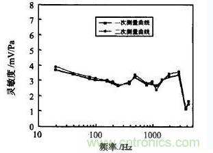 為檢測測量系統(tǒng)的重復(fù)性,實(shí)驗(yàn)對1#傳感器進(jìn)行了重復(fù)測量,圖3示出2次測量的靈敏度變化曲線。