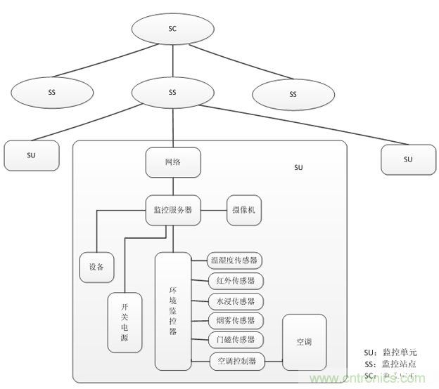 動力環(huán)節(jié)監(jiān)測系統(tǒng)應用在機房、基部站等無人值守的環(huán)境中,對局站內的通訊電源、蓄電池組、UPS、發(fā)電機、空調等智能、非智能設備以及溫濕度、煙霧、地水、門禁等環(huán)境量實現(xiàn)“遙測、遙信、遙控、遙調”等功能。為了實現(xiàn)對多個量的監(jiān)測,動環(huán)系統(tǒng)集成了各種類的傳感器,是多傳感器集成系統(tǒng)傳感器“多類型”的一個經(jīng)典案例。同時,此監(jiān)控系統(tǒng)充分利用了通訊傳輸設備所能提供的各種傳輸信道資源,可以實現(xiàn)多級網(wǎng)管,能夠對所有局站的全參數(shù)、全方位的監(jiān)控,這又很好體現(xiàn)了多傳感器集成系統(tǒng)傳感器“多數(shù)量”的一面。動環(huán)監(jiān)測系統(tǒng)的組成如下: