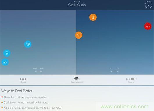 測(cè)試人員發(fā)現(xiàn),CubeSensors給出的這些信息較想象中更為有用。例如,產(chǎn)品提示一處起居室的溫度有點(diǎn)低,如果適當(dāng)提升溫度會(huì)讓人感覺(jué)更加舒適及放松。而在辦公室中,CubeSensors提示改善光照條件能夠幫助提升工作效率。在臥室中,產(chǎn)品給出了需要開(kāi)窗以便改善空氣質(zhì)量的建議。用戶除了查看數(shù)據(jù)之外,還能看到應(yīng)用給出的實(shí)用建議,例如“盡快開(kāi)窗”或“提升溫度會(huì)讓你感覺(jué)更加舒適”。盡管看起來(lái)似乎平淡無(wú)奇,但CubeSensors背后的團(tuán)隊(duì)表示,通過(guò)這些小建議,產(chǎn)品可以幫助用戶避免罹患感冒、過(guò)敏、頭疼等癥狀。