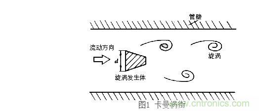 根據(jù)卡曼渦街理論(見圖一),在無限界流場中垂直插入一根無限長的非線性阻力體(即旋渦發(fā)生體C,風速傳感器的探頭橫桿),當風流流經(jīng)旋渦發(fā)生體C時,在漩渦發(fā)生體邊緣下游側(cè)會產(chǎn)生兩排交替的、內(nèi)旋的旋渦列(即氣流旋渦),而旋渦的產(chǎn)生頻率f正比于流速V,用公式表示如下: