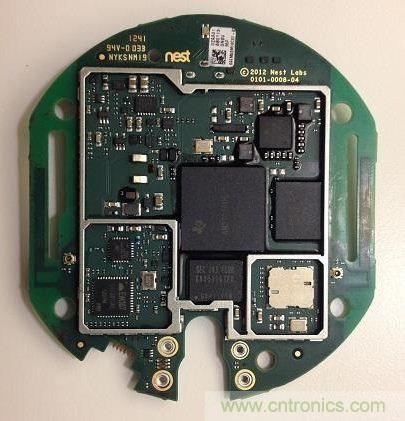 移除Nest恒溫器主板的金屬屏蔽罩后,可以看到一個(gè)德州儀器(TI)Sitara CPU、電源管理和USB芯片、閃存、32Mx16 SDRAM及一個(gè)村田(Murata)Wi-Fi模塊。此外,還有一個(gè)ZigBee網(wǎng)絡(luò)協(xié)處理器,表明該器件將來(lái)可以進(jìn)行擴(kuò)展。