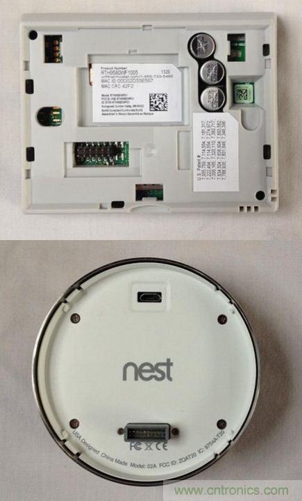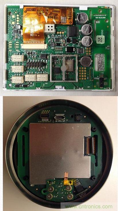 霍尼韋爾恒溫器的單個(gè)PCB上包括多個(gè)DC-DC轉(zhuǎn)換器、穩(wěn)壓器和整流器、一個(gè)8通道12位ADC、128MB SDRAM、32M閃存和博通(Broadcom)Wi-Fi模塊(屏蔽罩移除)。主處理器是愛(ài)特梅爾(Atmel)926 ARM處理器,外面包覆了金屬屏蔽罩,僅在扁平帶狀電纜至顯示器下方可見(jiàn)。Nest恒溫器的主要電子元器件全部被包覆在單個(gè)屏蔽罩下??拷撞康膬蓚€(gè)附加電路提供檢測(cè)功能。PCB與顯示器通過(guò)螺絲固定,金屬環(huán)被卡在兩者之間,但可以自由旋轉(zhuǎn)。