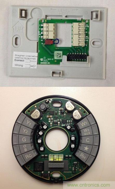 霍尼韋爾恒溫器的入墻式插座是一塊簡(jiǎn)單的、帶有暖通空調(diào)(HVAC)單元線纜連接器的雙層PCB。Nest恒溫器的入墻式插座帶有有源器件,包括一個(gè)意法半導(dǎo)體(STMicro)STM32L151微控制器和一個(gè)8通道模擬多路開(kāi)關(guān)。插座板中間的氣泡水準(zhǔn)器用于協(xié)助將背板合適地安裝在墻上。