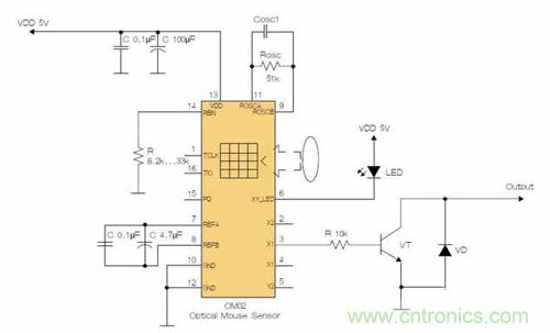鼠標(biāo)芯片的CMOS光學(xué)傳感器可提供非機(jī)械式跟蹤引擎。在該芯片內(nèi)部可完成圖像的捕獲、數(shù)字化和數(shù)字處理。就拿簡單且低成本的OM02來說,該傳感器通過采集表面圖像幀來測(cè)量位置,并通過數(shù)學(xué)運(yùn)算判定運(yùn)動(dòng)方向和距離。該傳感器安裝聚苯乙烯光學(xué)封裝中,設(shè)計(jì)用來與高亮度LED一起使用。它有一個(gè)完整且緊湊的跟蹤引擎;沒有活動(dòng)部件,也不要求精密的光學(xué)對(duì)準(zhǔn)。OM02可以為X和Y方向運(yùn)動(dòng)產(chǎn)生正交輸出信號(hào)。分辨率約為0.0025英寸,運(yùn)動(dòng)速度最高為每秒16英寸。
