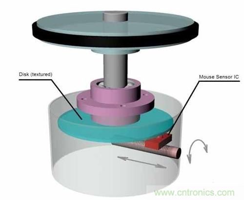 【導(dǎo)讀】本設(shè)計(jì)實(shí)例使用光學(xué)電腦鼠標(biāo)中的傳感器測(cè)量圓盤的旋轉(zhuǎn),其中的圓盤可以通過機(jī)械方式連接到任何一種旋轉(zhuǎn)裝置。通過沿著圓盤半徑改變傳感器位置,該方案可以調(diào)整每次旋轉(zhuǎn)的脈沖。