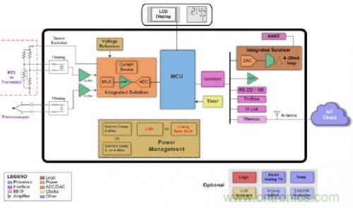 雖然基本傳感器變送器電路的 MCU 和數據轉換器通常專為低工作電流而優(yōu)化,但是高性能智能傳感器應用中增加的功能導致了電流需求的升高。例如:當該電路包含了諸如隔離、校準和診斷、液晶顯示器接口、或無線連接選項(如藍牙低能耗或無線 HARTâ)等特性時,電流消耗將較大。