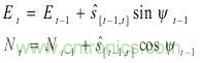 方程式2表述航位推算(DR)算法,該方法是基于步數(shù)計(jì)算,而不是加速度和角速率的積分運(yùn)算。方程式2的航位推算過(guò)程有三個(gè)要素:1)在t-1 (Et-1, Nt-1)時(shí)最后一次已知的用戶絕對(duì)位置(用東北坐標(biāo)系表示);2)從t-1到t()的步長(zhǎng);3)從時(shí)間t-1開始的航向 (ψ) 可以算出新位置相對(duì)已知位置(Et-1, Nt-1)的坐標(biāo)(Et, Nt),如方程式2所示。