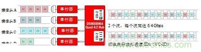 圖3所示為四攝像頭系統(tǒng),具有由彩色塊所示的不同數(shù)據(jù)速率。聚合數(shù)據(jù)在移動工業(yè)處理器接口(MIPI)攝像頭串行接口(CSI)-2端口0和1兩者處呈現(xiàn)。CSI-2總線具有“突發(fā)性”,意味著其以固定數(shù)據(jù)速率運行、將發(fā)送數(shù)據(jù)為可用狀態(tài),并且當(dāng)機器空閑時恢復(fù)到低功率(LP)狀態(tài)。因此,傳感器速度可在不改變ECU處理器時序的條件下進(jìn)行變化。即使傳感器鏈路以獨立頻率運行,解串器集線器在單個參考時鐘上也可將數(shù)據(jù)提供給片上系統(tǒng)(SoC)處理器,從而簡化系統(tǒng)時序。