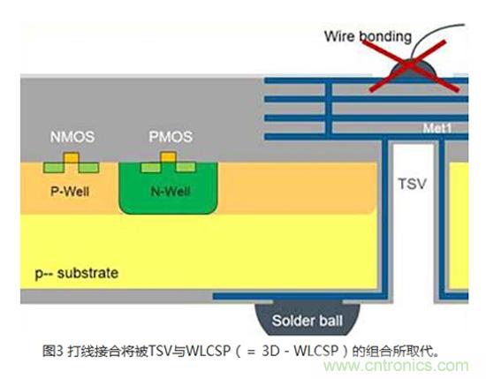 另外,直徑和間距更為縮減的下一世代TSV技術(shù),將能夠透過結(jié)合背面RDL和晶圓級芯片尺寸封裝(WLCSP的)TSV,也就是所謂的3D-WLCSP來替換任何已經(jīng)處理和完成的晶圓的接墊(Pad)。 即使在制造過程完成后,客戶也能夠靈活地決定產(chǎn)品是否應(yīng)在正面進行打線接合,或者在背面使用WLCSP技術(shù)進行凸塊封裝。 這種新技術(shù)概念允許在任何芯片,甚至是在第三方芯片上處理TSV,做為后處理步驟之一(后鉆孔概念)。 在TSV開發(fā)方式中,其直徑和最小間距能極佳地匹配第三方芯片所采用制程的接墊需求(圖3)。
