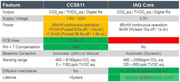 和CCS801相比,CCS811繼承了其很多優(yōu)點(diǎn),如:出色的感測范圍與精度、支持長達(dá)5年壽命的特殊工藝等等。而兩者最大的差異在于,CCS811是一個數(shù)字VOC傳感器,其內(nèi)部集成了一個MCU,可以直接對傳感器的驅(qū)動和測量進(jìn)行管理,并通過一個I2C接口與外部進(jìn)行數(shù)據(jù)通信。雖然集成了更多的功能,CCS811仍然保持了相當(dāng)“纖細(xì)”的身材,采用2.7 x 4.0mm的LGA封裝,使得PCB占板面積可以節(jié)省60%,節(jié)省了BOM成本。同時,由于內(nèi)部還集成了相應(yīng)的算法,使得終端產(chǎn)品的開發(fā)也得以簡化,進(jìn)一步降低了整體的成本。想必消費(fèi)類用戶看到下面這個CCS811的性能清單,會非常動心。