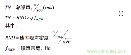 除了RND參數(shù)外,MEMS IMU數(shù)據(jù)手冊(cè)有時(shí)會(huì)使用輸出噪聲等參數(shù)指定特定濾波器配置的陀螺儀固有噪聲。輸出噪聲通常使用角速率標(biāo)準(zhǔn)單位(°/s),并使用均方根(rms)等統(tǒng)計(jì)術(shù)語來描述總噪聲幅度。