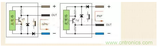 PNP型當(dāng)傳感器有檢測(cè)信號(hào)VT導(dǎo)通,正極的電流流向輸出端OUT,輸出端OUT電位接近正極,通常說(shuō)的低電平翻轉(zhuǎn)成高電平。