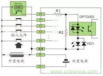 PLC 的數(shù)字量輸入接口并不復(fù)雜,PLC 為了提高抗干擾能力,輸入接口都采用光電耦合器來(lái)隔離輸入信號(hào)與內(nèi)部處理電路的傳輸。因此,輸入端的信號(hào)只是驅(qū)動(dòng)光電耦合器的內(nèi)部 LED 導(dǎo)通,被光電耦合器的光電管接收,即可使外部輸入信號(hào)可靠傳輸。