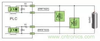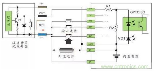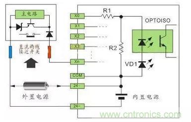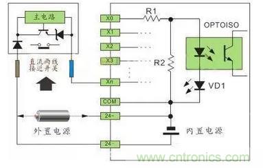 直流電可以由PLC內(nèi)部提供也可以外接直流電源提供給外部輸入信號(hào)的元件。R2在電路中的作用是旁路光電耦合器內(nèi)部LED的電流,保證光電耦合器LED不被兩線(xiàn)制接近開(kāi)關(guān)的靜態(tài)泄漏電流導(dǎo)通。