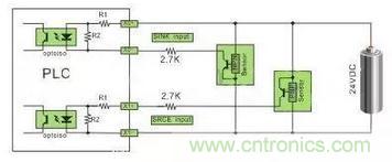 注:24VDC供電的傳感器,在輸入回路上需要串聯(lián)限流電阻,R1為10Ω,R2為2KΩ,不串聯(lián)限流電阻,將燒毀接口回路,限流電阻取值2.7KΩ。