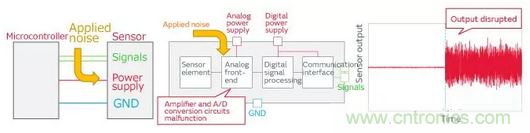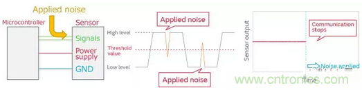 以上這樣,One chip傳感器的信號線或電源線施加噪聲時,會發(fā)生通信停止或輸出值紊亂的誤操作。