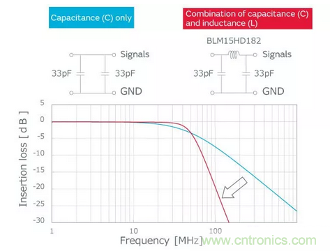 噪聲級別小或信號和噪聲的頻率相差大的情況下,可以只用電容器進行降噪,但如果信號頻率和噪聲頻率相近時,需要電感器和電容器組合來構(gòu)成插入損耗陡峭的濾波器。