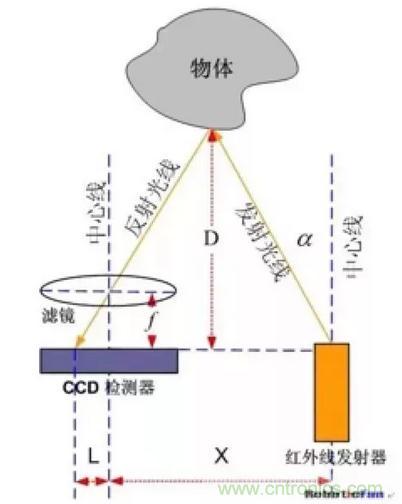 一般的紅外測距都是采用三角測距的原理。紅外發(fā)射器按照一定角度發(fā)射紅外光束,遇到物體之后,光會反向回來,檢測到反射光之后,通過結(jié)構(gòu)上的幾何三角關系,就可以計算出物體距離D。