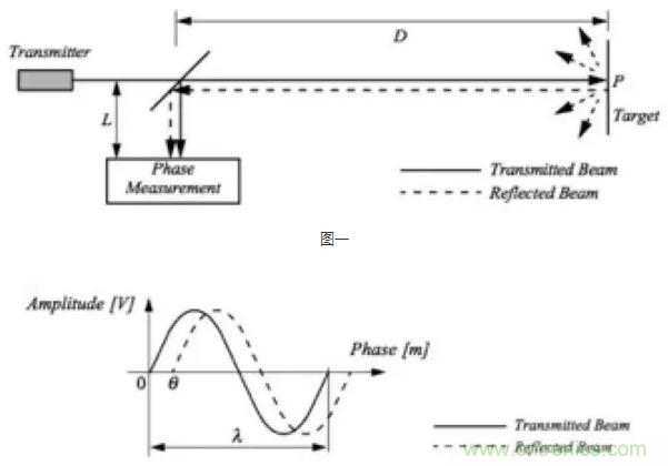 比較簡單的方案是測量反射光的相移,傳感器以已知的頻率發(fā)射一定幅度的調(diào)制光,并測量發(fā)射和反向信號之間的相移,如上圖一。調(diào)制信號的波長為lamda=c/f,其中c是光速,f是調(diào)制頻率,測量到發(fā)射和反射光束之間的相移差theta之后,距離可由lamda*theta/4pi計算得到,如上圖二。