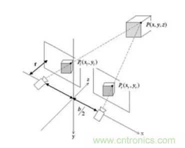 雙目視覺的測距本質(zhì)上也是三角測距法,由于兩個攝像頭的位置不同,就像我們?nèi)说膬芍谎劬σ粯?,看到的物體不一樣。兩個攝像頭看到的同一個點P,在成像的時候會有不同的像素位置,此時通過三角測距就可以測出這個點的距離。與結(jié)構(gòu)光方法不同的是,結(jié)構(gòu)光計算的點是主動發(fā)出的、已知確定的,而雙目算法計算的點一般是利用算法抓取到的圖像特征,如SIFT或SURF特征等,這樣通過特征計算出來的是稀疏圖。