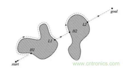 改進后的Bug2算法中,機器人開始時會跟蹤物體的輪廓,但不會完全圍繞物體一圈,當機器人可以直接移動至目標時,就可以直接從障礙分離,這樣可以達到比較短的機器人行走總路徑。