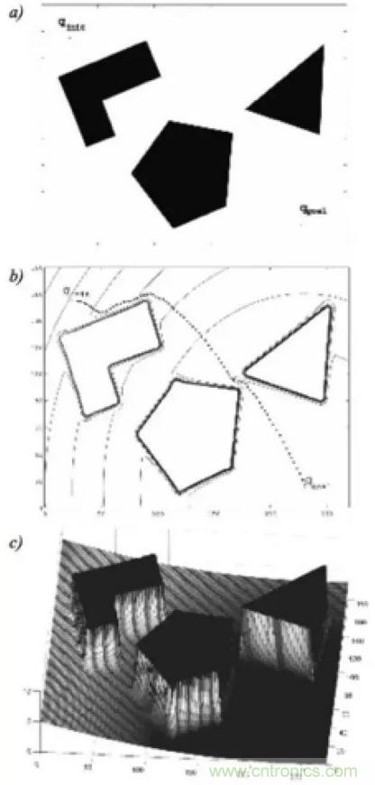 上面這個圖是勢場比較典型的示例圖,最上的圖a左上角是出發(fā)點,右下角是目標點,中間三個方塊是障礙物。中間的圖b就是等勢位圖,圖中的每條連續(xù)的線就代表了一個等勢位的一條線,然后虛線表示的在整個勢場里面所規(guī)劃出來的一條路徑,我們的機器人是沿著勢場所指向的那個方向一直行走,可以看見它會繞過這個比較高的障礙物。