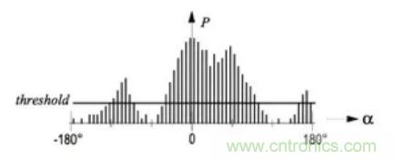 它執(zhí)行過程中針對移動機器人當前周邊環(huán)境創(chuàng)建了一個基于極坐標表示的局部地圖,這個局部使用柵格圖的表示方法,會被最近的一些傳感器數(shù)據(jù)所更新。VFH算法產(chǎn)生的極坐標直方圖如圖所示: