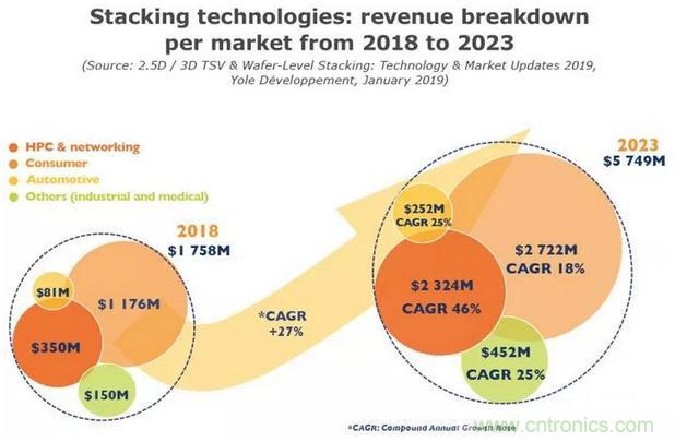 消費(fèi)類市場(chǎng)(主要是CIS應(yīng)用),是2018年堆疊封裝營(yíng)收的最大貢獻(xiàn)者,占據(jù)了65%以上的市場(chǎng)份額。盡管如此,高性能計(jì)算(HPC)是推動(dòng)3D封裝技術(shù)創(chuàng)新的主要應(yīng)用,到2023年期間,該應(yīng)用增長(zhǎng)速度最快,市場(chǎng)份額預(yù)計(jì)將從2018年的20%增長(zhǎng)到2023年的40%。