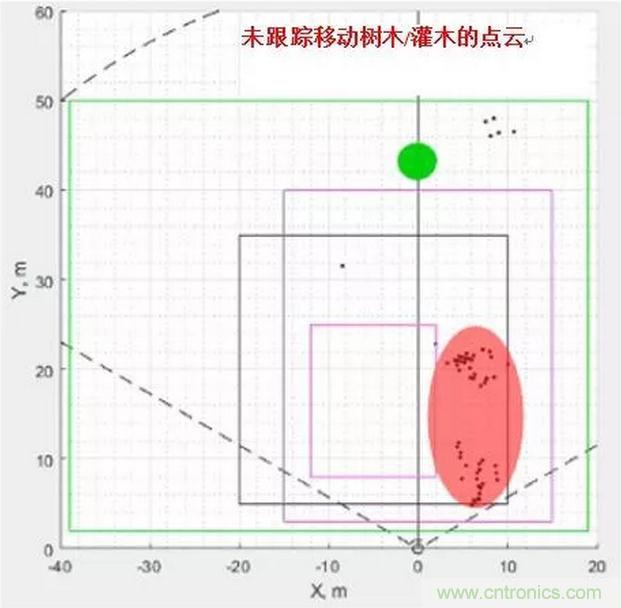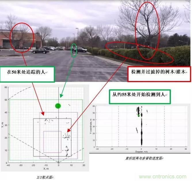 圖2顯示了使用毫米波技術(shù)的入侵檢測;毫米波傳感器分析場景中對象的速度,過濾掉移動背景中的運動,僅跟蹤人物。