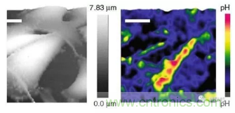 傳感器,該傳感器對(duì)0.01單位以下的pH值變化非常敏感,響應(yīng)時(shí)間為2 ms,空間分辨率為50 nm。