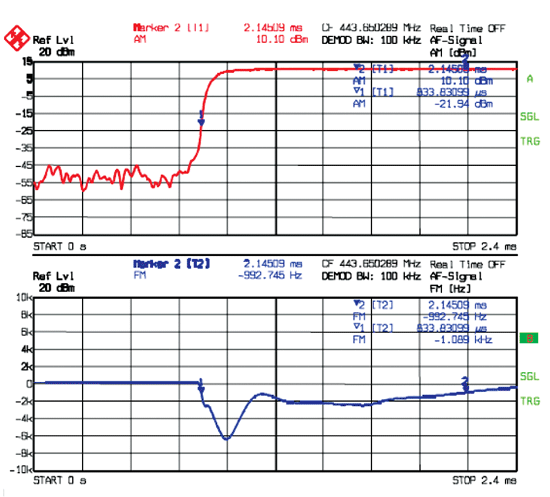對(duì)于發(fā)射機(jī)和頻綜源來說,它們的幅度、頻率和相位瞬態(tài)特性是重要的測試指標(biāo)。一般來說,頻率穩(wěn)定時(shí)間是指發(fā)射機(jī)在輸出電平達(dá)到一定數(shù)值(通常為穩(wěn)定輸出功率-30dB)開始,監(jiān)測FM解調(diào)頻譜,直到頻率穩(wěn)定到設(shè)計(jì)限值之內(nèi)的這一段時(shí)間。