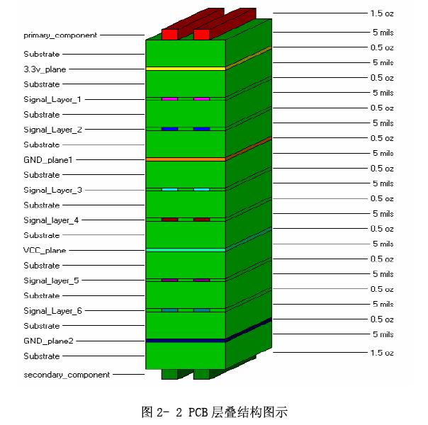 綜合以上三點,最后采用12層印制板,其中8個信號層(包括元件層),兩個地層,一個3.3V電源層,一個混合電源層(包括5V、2V、兩個2.5V)。用HyperLynx軟件優(yōu)化出來的PCB層疊結(jié)構(gòu)如圖2-2所示,總厚度為65.7mil,即1.67mm,滿足VME64規(guī)范要求。