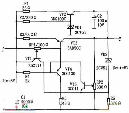 當(dāng)輸出電壓增大時(shí),三極管VT5基極偏壓減小,其集電極電流減小,電壓升高,從而引起三極管VT4基極電壓升高,電流減小,其發(fā)射極(即調(diào)整管VT3基極)電壓升高,電流減小,VT3管壓降Uce3增大,這樣就使輸出電壓降低,達(dá)到穩(wěn)壓的目的。輸出電壓可以通過調(diào)節(jié)電位器RP2加以改變。