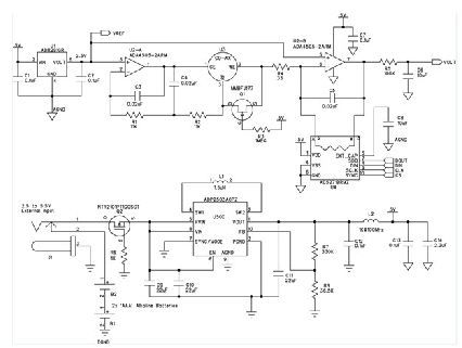 該電路由兩節(jié)AAA電池供電。使用二極管提供反向電壓保護(hù)會(huì)浪費(fèi)寶貴的電能,因此本電路使用P溝道MOSFET (Q2)。該MOSFET通過(guò)阻塞反向電壓來(lái)保護(hù)電路,施加正電壓時(shí)導(dǎo)通。MOSFET的導(dǎo)通電阻小于100 mΩ,因此它引起的壓降遠(yuǎn)小于二極管。除AAA電池以外,降壓-升壓調(diào)節(jié)器ADP2503還允許使用最高5.5 V的外部電源。在省電模式下工作時(shí),ADP2503的功耗僅38 μA.由L2、C12和C13構(gòu)成的濾波器可消除模擬電源軌產(chǎn)生的任何開(kāi)關(guān)噪聲。連接外部電源時(shí),該儀表不是通過(guò)一個(gè)電路來(lái)斷開(kāi)電池,而是利用一個(gè)插孔以機(jī)械方式斷開(kāi)電池,從而避免電能浪費(fèi)?! ?br />